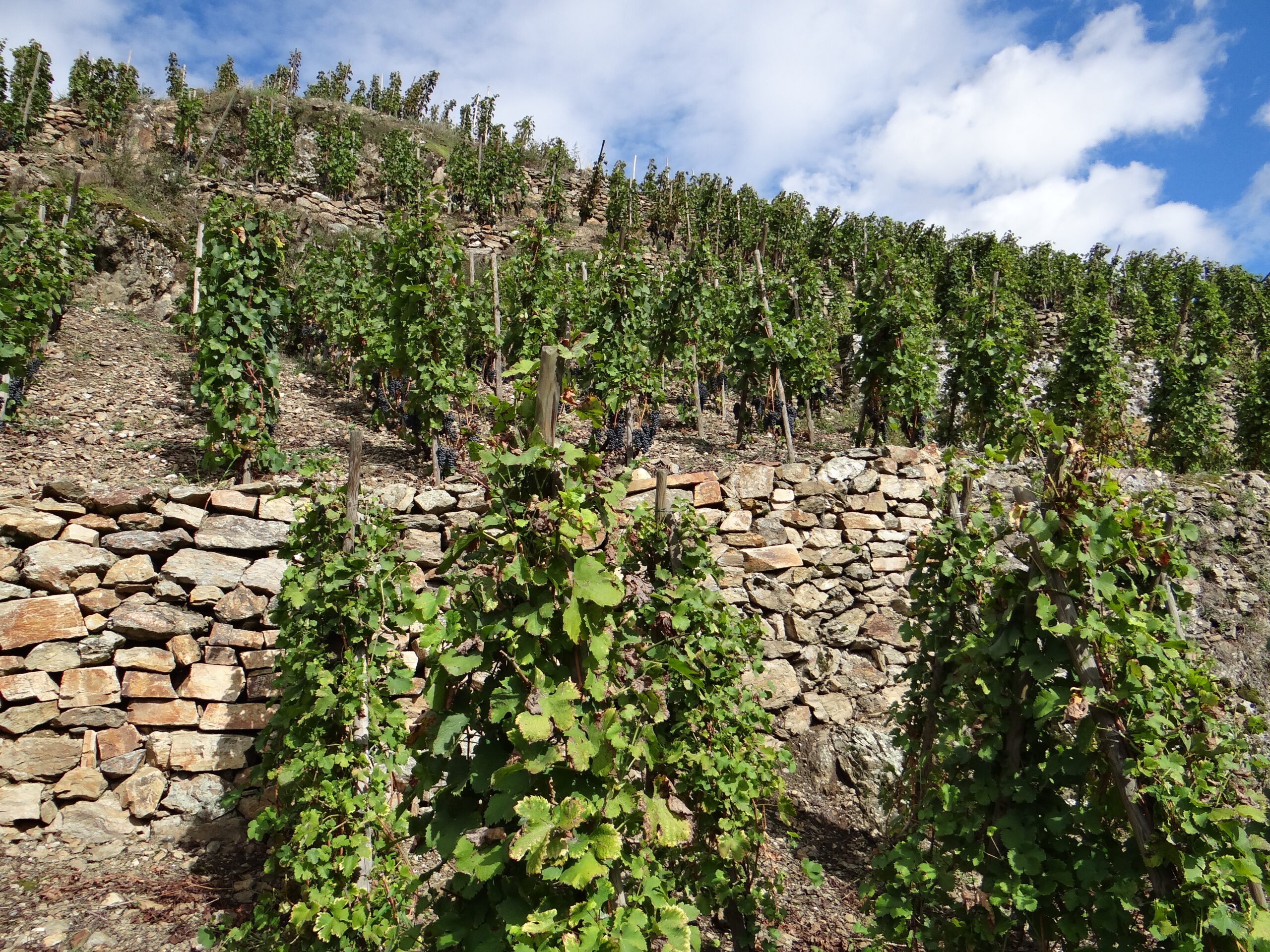 Auf den typischen Böden der Côte Brune: 4 Hektar terrassierte Weinberge am Château de Montlys, nach Süden und Südosten mit Blick auf die Rhône. Reben auf 170–270 m Höhe, auf stark zersetzten, eisenoxidhaltigen mikaschistischen Böden.